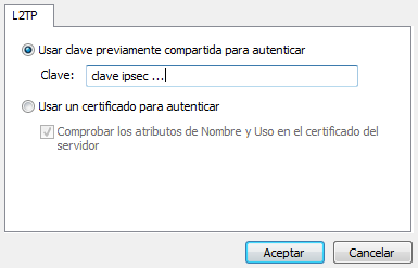 Seleccionaremos «Usar clave previamente compartida para autentificar» y en el campo Clave, escribiremos la contraseña IPSec que nos hayan proporcionado y pulsamos el botón «Aceptar»