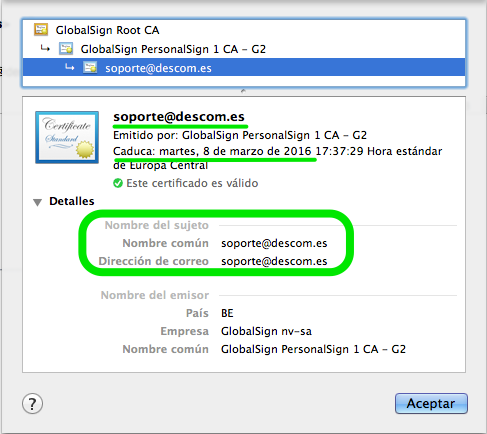 Pincha en el icono de check para ver los detalles del certificado. Se mostará una página como esta indicando los detalles del certificado. Si el certificado es válido y cuando caduca y el nombre asociado a dicho certificado.